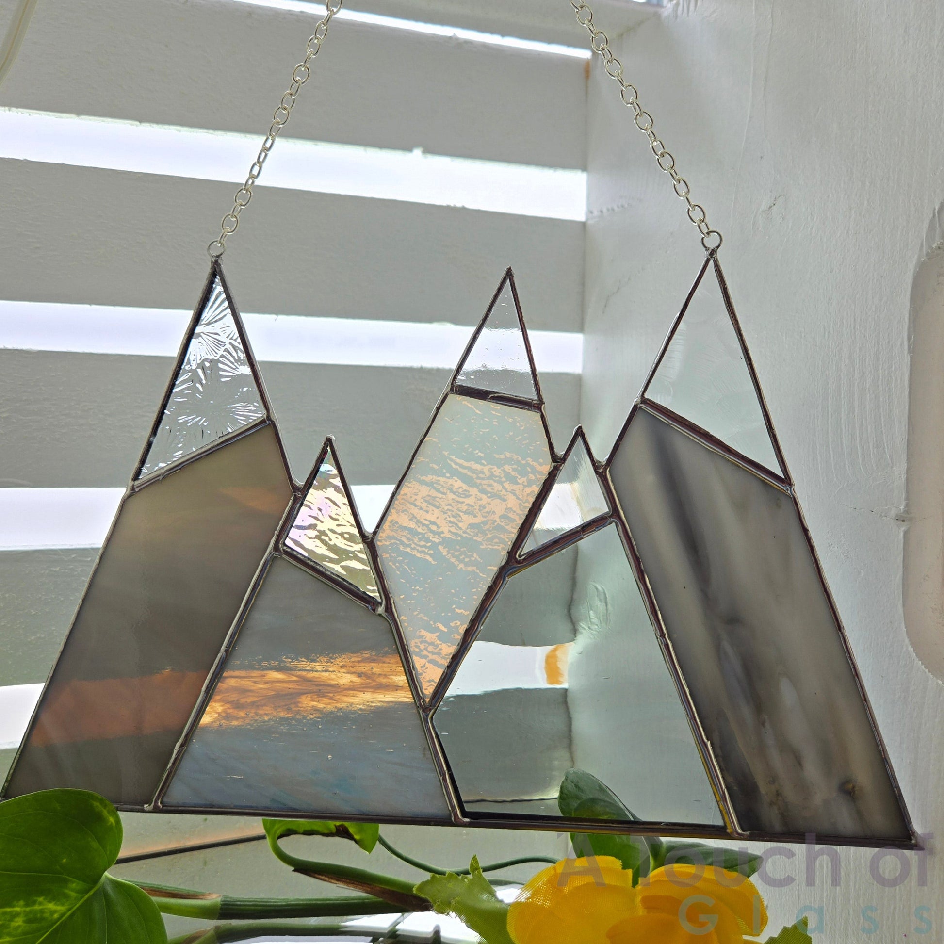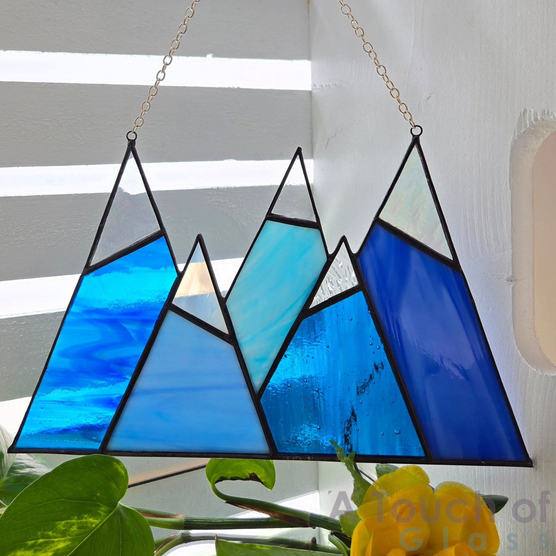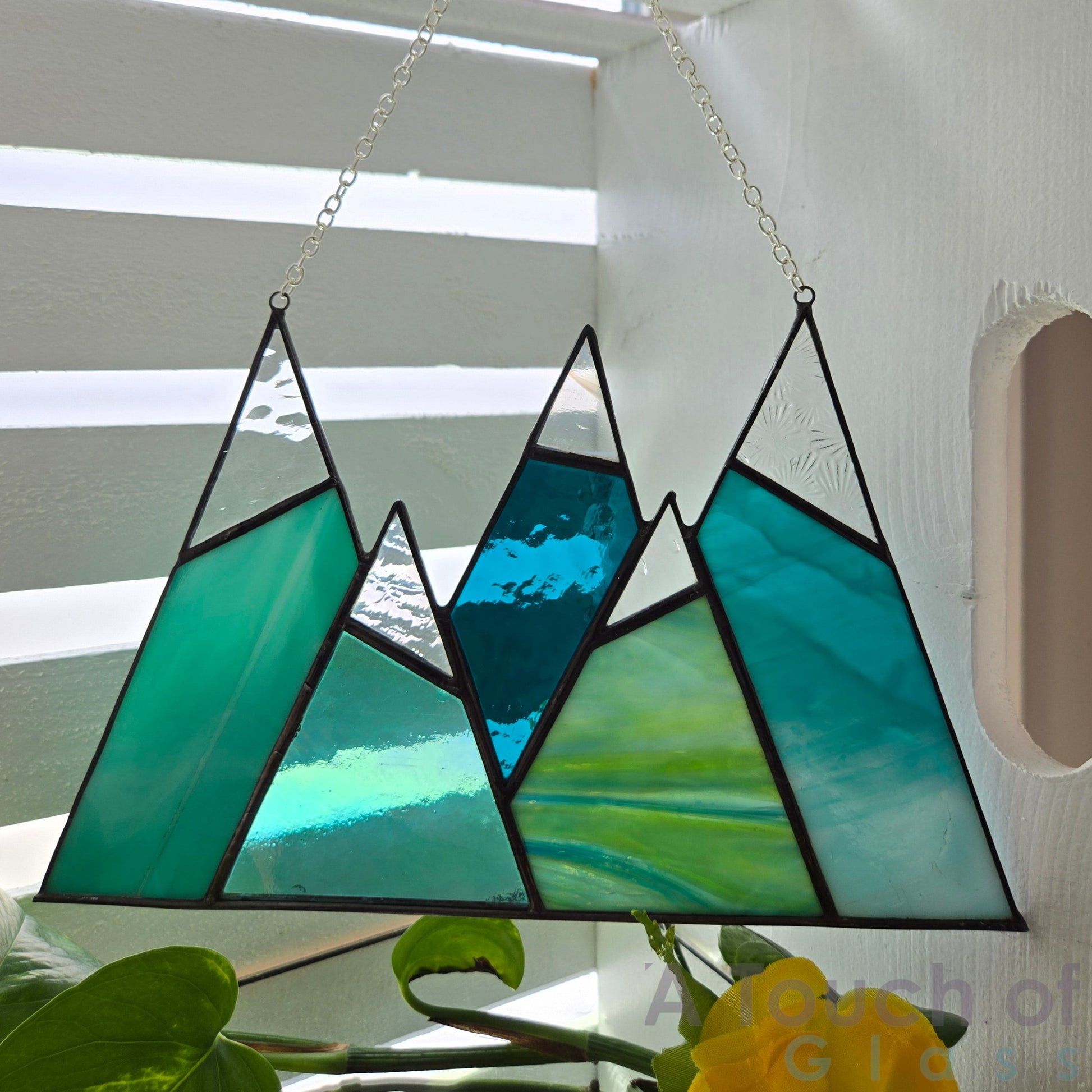 Add a Mountain view to any window with these stained glass mountains. They have been created to either hang in a window or sit beautifully on a window ledge or shelf in your home. Measuring 14cm tall and 23cm long (5.5"x9").