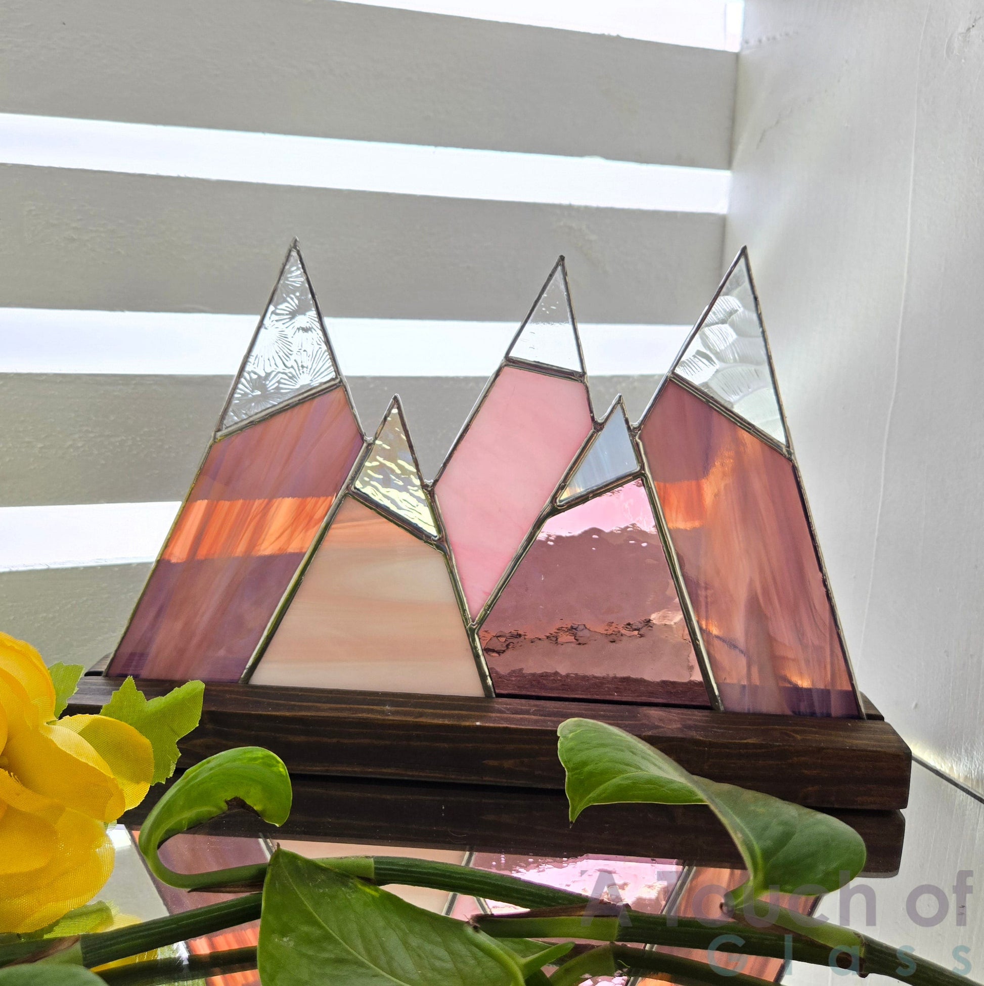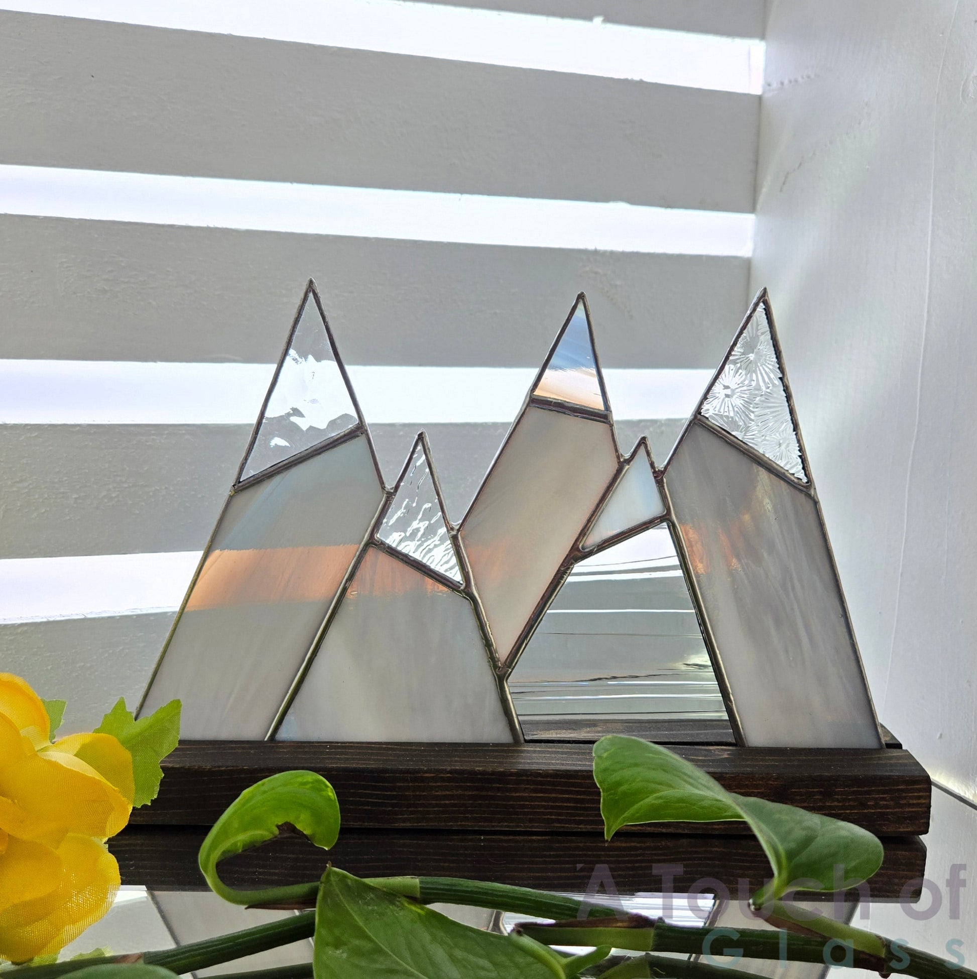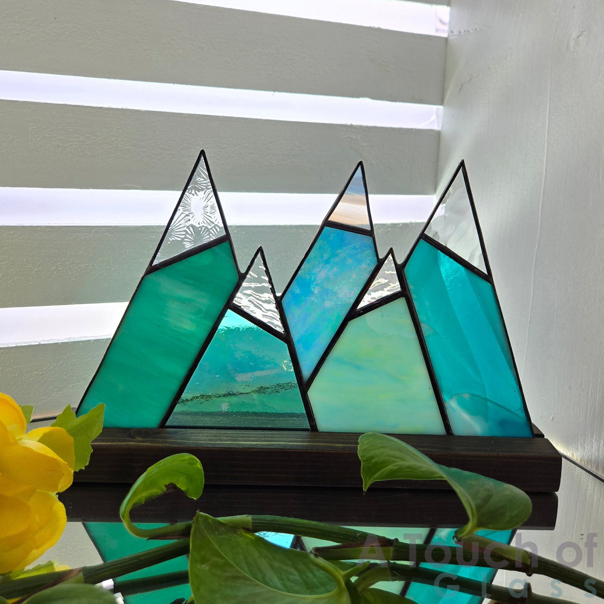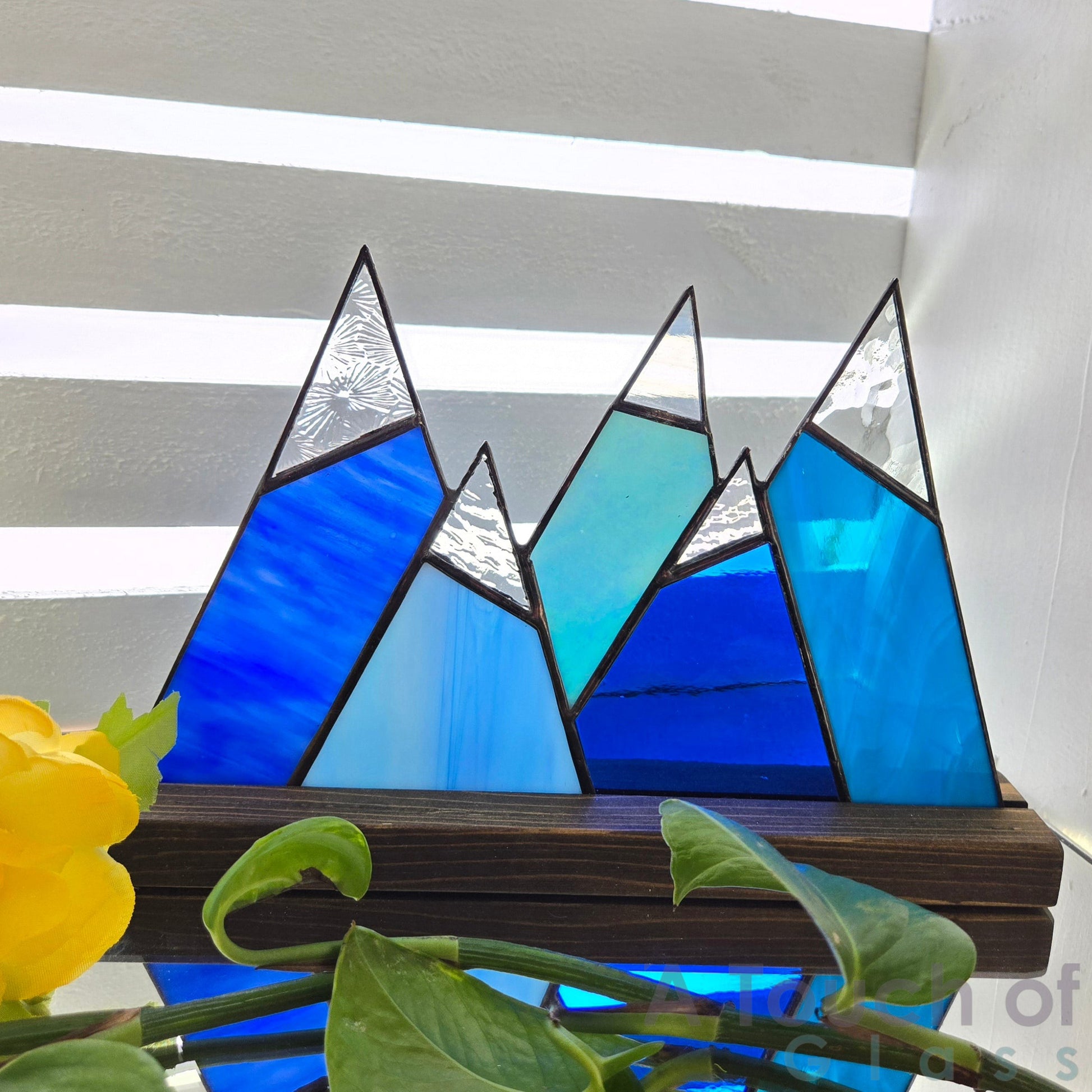 Add a Mountain view to any window with these stained glass mountains. They have been created to either hang in a window or sit beautifully on a window ledge or shelf in your home. Measuring 14cm tall and 23cm long (5.5"x9").